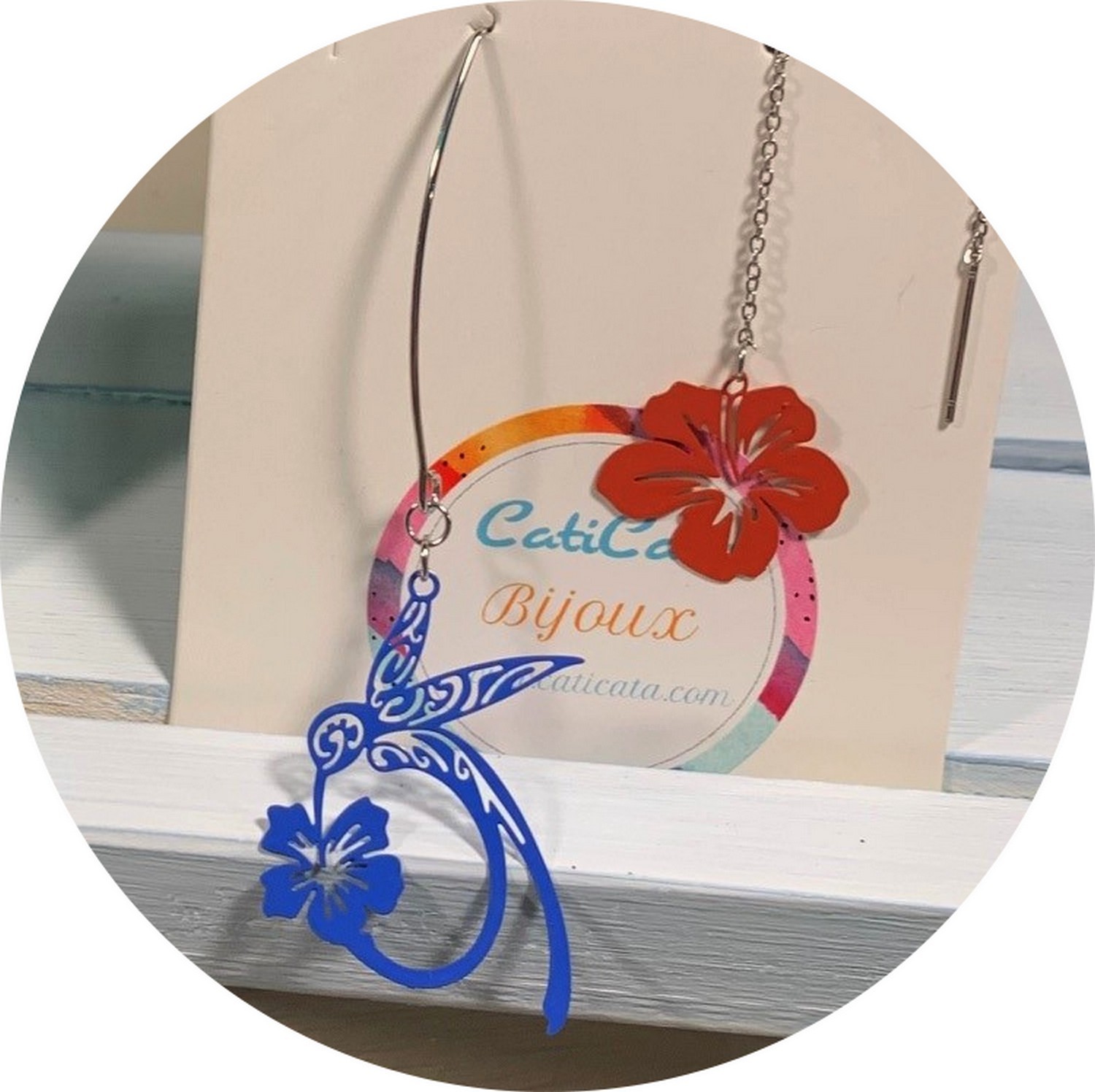 La Photo en vignette vous présente une de nos Créations à titre d'illustration, Boucles d'oreilles Colibri et Hibiscus montées sur Acier inoxydable.