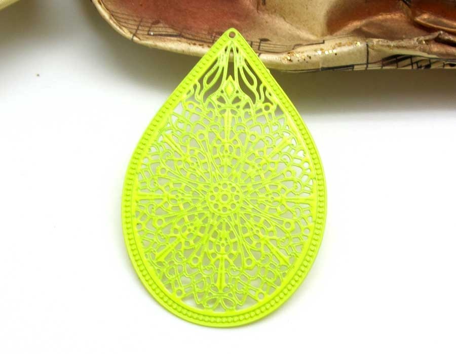 Déstockage 50% : 4 Pendentifs Estampes Métal Grande Goutte Filigrane Vert Anis Fluo - La remise de 50% est inclue dans le prix affiché.