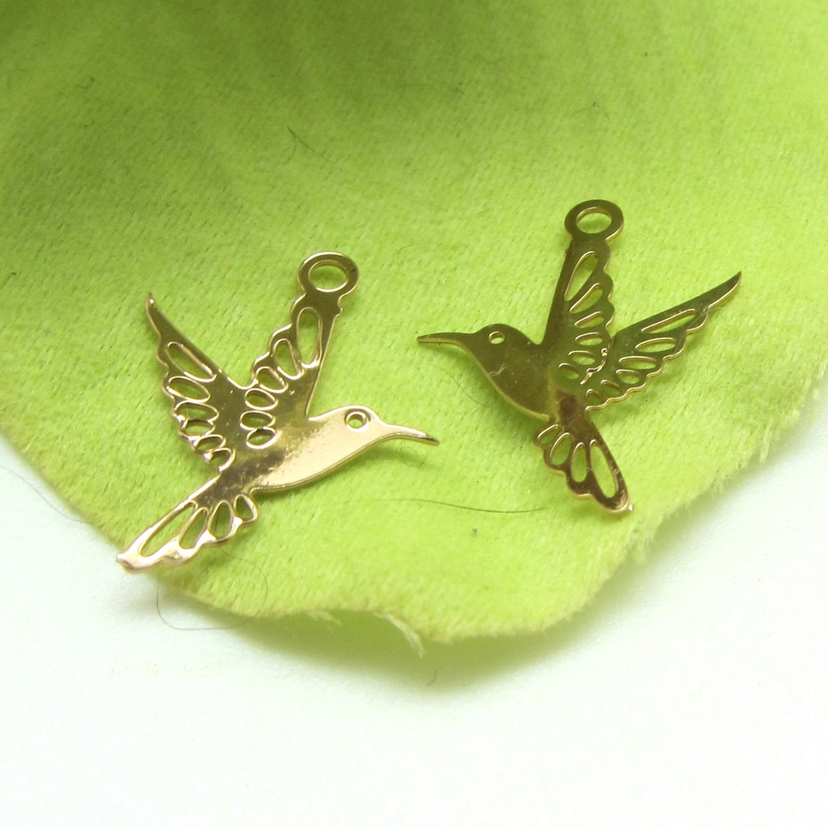 4 légères breloques en métal délicatement filigranées représentant un oiseau colibri de couleur Doré.