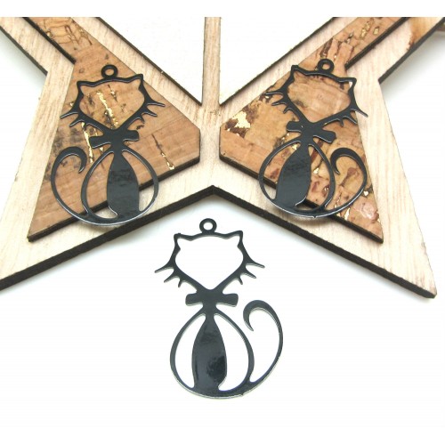 2 Pendentifs Lune Chat Chaton, Estampe Filigrane Lune Chat, Noir, 25*20 mm
